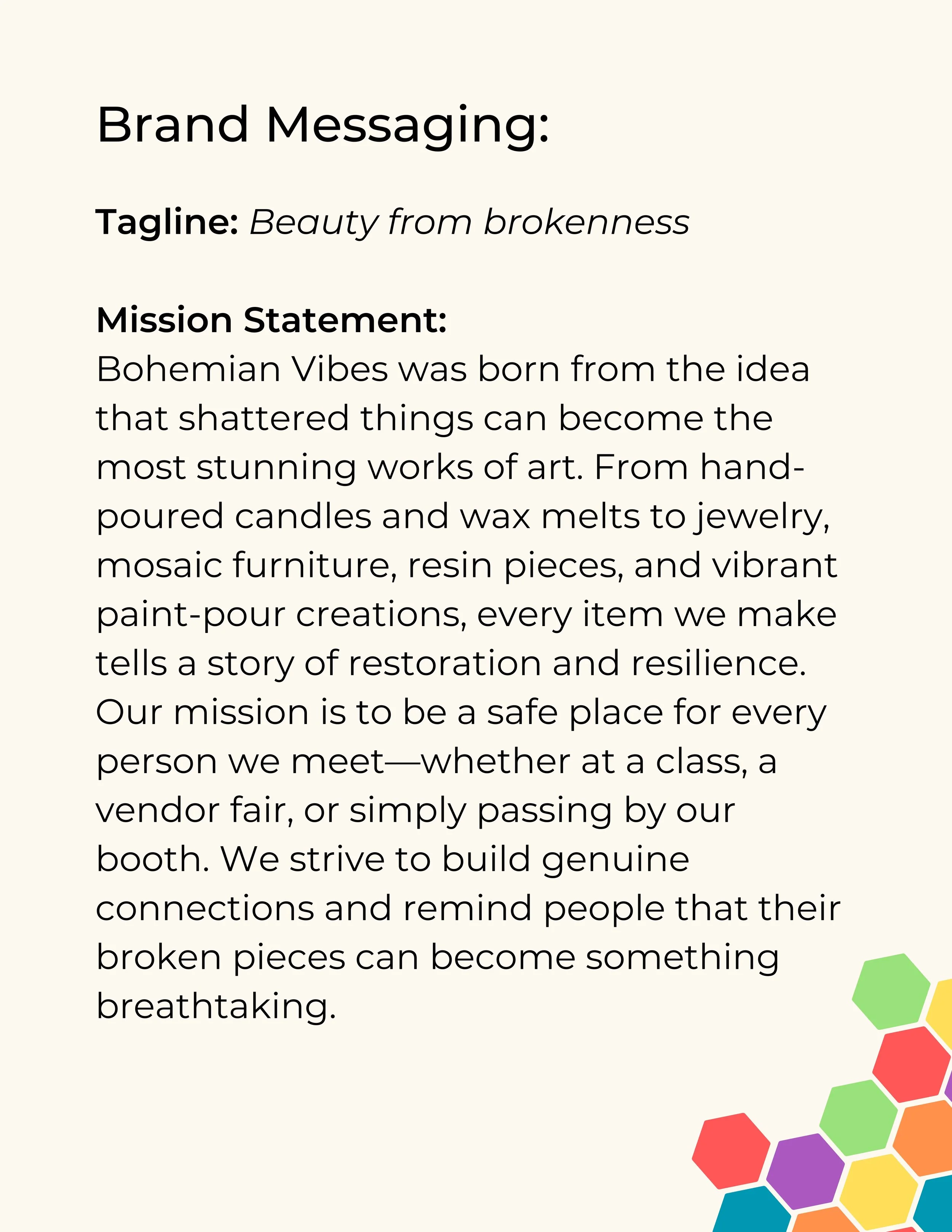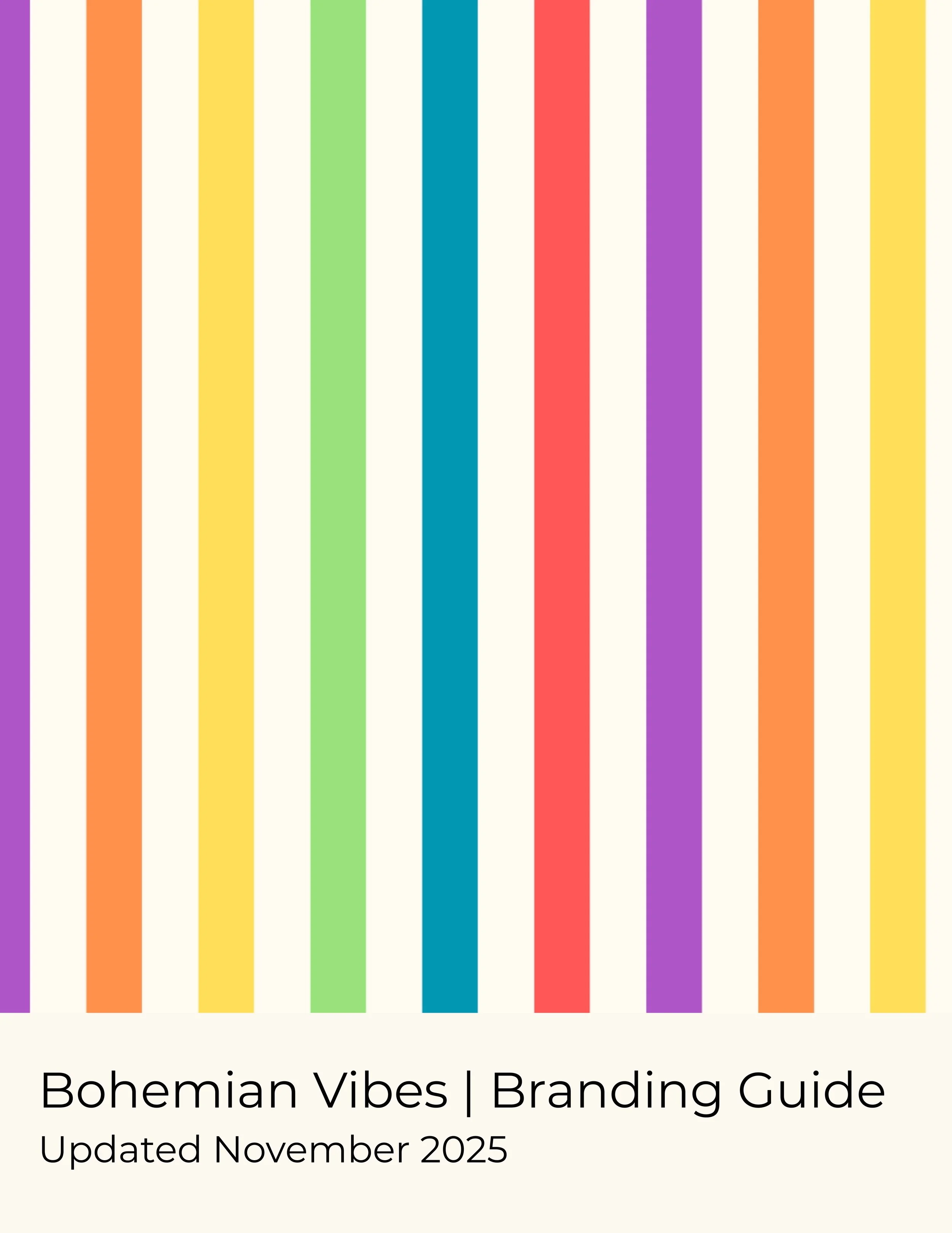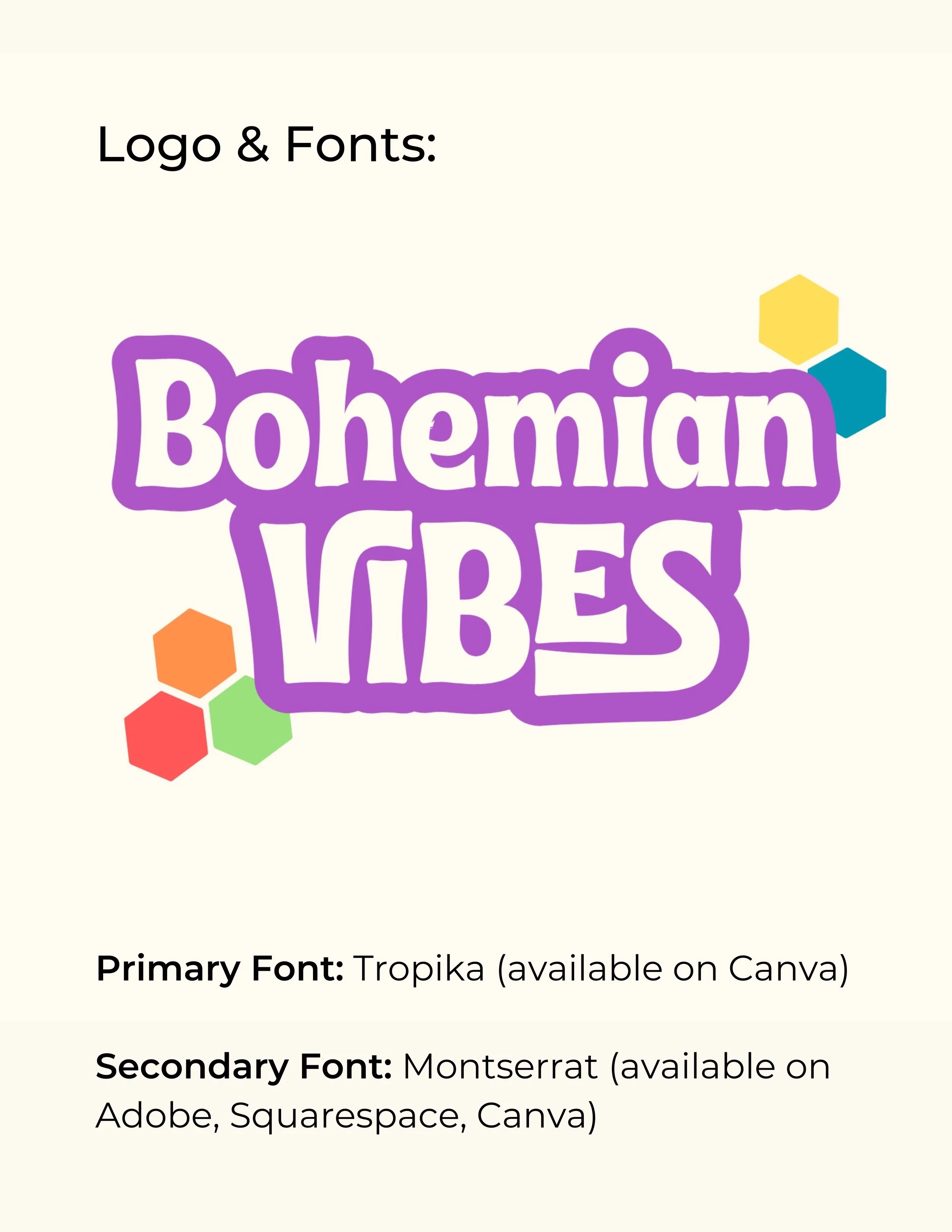 This fun, free-spirited, women-owned small business came to me ready to transform their existing name and slogan into a complete brand identity. With their target audience in mind, I developed a cohesive visual system—including a custom logo, curated font pairings, and a refined color palette—that reflects their artistic, boho style.